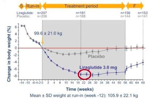 In fig.1 si può notare come l’assunzione di Liraglutide rispetto al placebo porti ad un calo ponderale fino al 8% del peso iniziale dopo un periodo pre-trattamento in cui i soggetti hanno effettuato una dieta ipocalorica. Inoltre, si evidenzia il raggiungimento del plateau di perdita di peso attorno alla settimana 24 (circa 6 mesi), settimana dopo la quale il peso tende a stabilizzarsi per poi aumentare leggermente. Questo dato concorda con altre ricerche presenti in letteratura, che indicano come la fase di perdita di peso abbia una durata di circa 6 mesi, dopo i quali è necessario iniziare una fase di mantenimento.