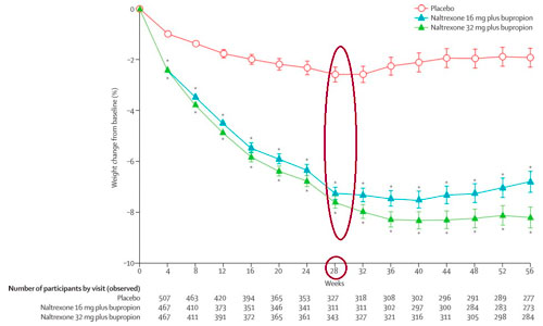 Uno studio di 56 settimane con la combinazione Naltrexone/Bupropione ha evidenziato un calo ponderale medio di 5 kg in più rispetto al placebo.